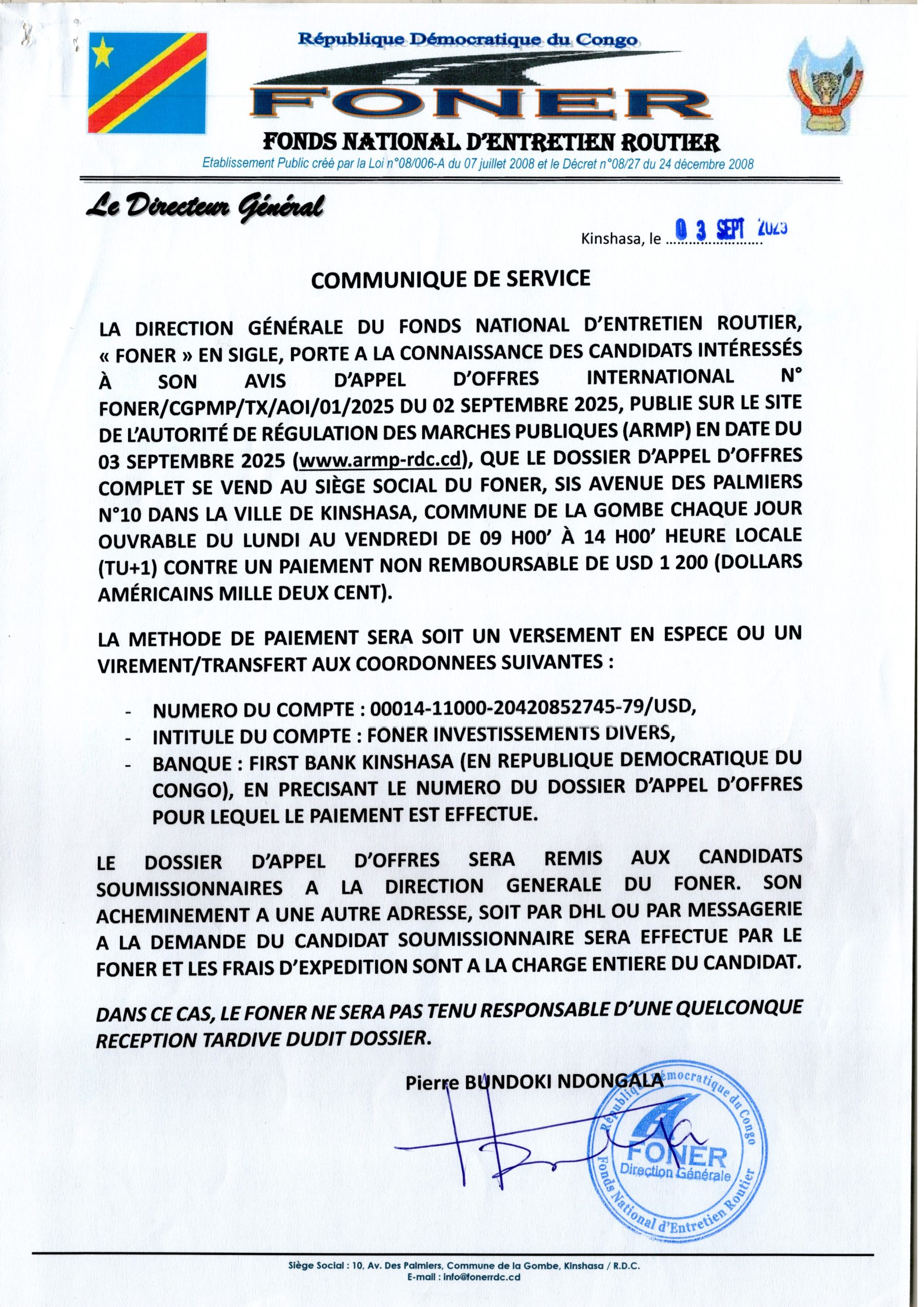 Communique de Service de la Direction Générale du Fonds National d’Entretien Routier (Foner) Relative à l’appel D’offre N°Foner/Cgpmp/Tx/Aoi/01/2025 Du 02 Septembre 2025